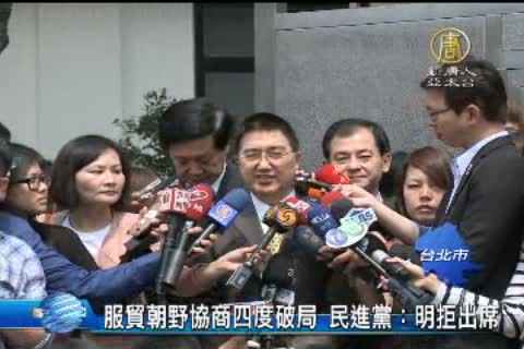 【新唐人亞太台2014年3月28日訊】今天(28日)朝野立委在立法院長王金平官邸,展開第四度協商,經過一個半小時討論,協商再度破裂,雙方仍然無法取得共識,民進黨更揚言,星期六的協商,恕不奉陪。