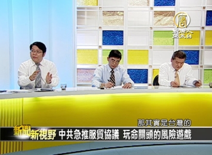 【新唐人亞太台2014年3月29日訊】獨到觀點 掌握真相,觀眾朋友大家好 歡迎您收看新聞新視野,我是張明筑。在這集的節目當中,我們要為您透視,在兩岸服貿協議的背後,隱藏了中共對經濟和,台灣國家安全的威脅。