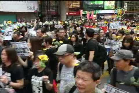 數百名遊行人士下午約一時半在銅鑼灣東角道出發,遊行到遮打花園集會,除了在港讀書及工作的台灣人也有香港大專院校學生,他們響應大會呼籲穿上黑衣,手持太陽花,要求馬英九總統正視民意。