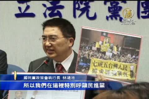 國民黨政策會執行長 林鴻池:「我們很多民生法案都要付諸審查,所以我們在這裡特別呼籲民進黨,明天張慶忠張召委排的服貿審查,希望大家回歸理性平和,讓我們國政能夠順利來運轉。」