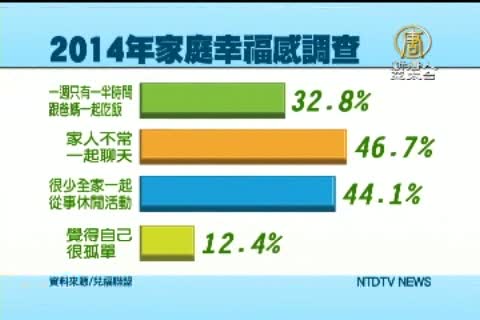 【新唐人亞太台2014年4月4日訊】4月4號是兒童節,兒福聯盟公布「2014年家庭幸福感調查」,有近五成的小朋友說家人間不常互動,還有一成的小朋友覺得孤單,顯示台灣爸媽過於忙碌,無法好好陪伴小孩。