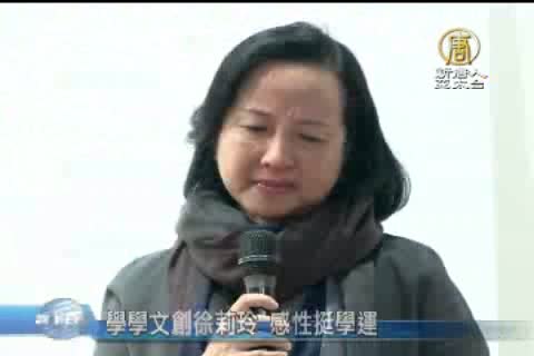 【新唐人亞太台2014年4月7日訊】太陽花學運第20天,藝文界人士發起「人人都有太陽花」活動,力挺學運,學學文創董事長徐莉玲,感性邊哭邊致詞,還說行政院長江宜樺夫人李淑珍看到的學生,和她「差很大」。學學文創董事長徐莉玲一開口就哭了,反駁行政院長江宜樺夫人李淑珍眼中看到的學生。她感性表示:如果現在連誠實出來說話都不敢,我們要交給我們的下一代,是一個這樣子不完美的制度?昨天下午,藝文界人士齊聚,用詩、繪畫、音樂,各種不同的形式,力挺太陽花學潮。