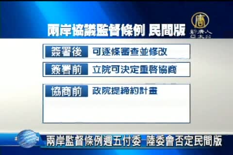 【新唐人亞太台2014年4月9日訊】學生退出議場之後,這個星期五,立法院將在院會,將七個版本的兩岸協議監督條例草案付委,不過,今天陸委會主委王郁琦受訪時,以憲政疑慮、兩岸關係倒退的理由,否定民間版本,引起在野黨抨擊。