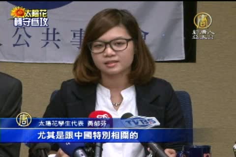 太陽花學生代表 黃郁芬:「其實我們並不是反自由貿易協定,這樣子的簽屬,我們所要反的是,在這樣子的簽署過程中,它的內容是怎麼制定,尤其是跟中國特別相關的,比如說言論自由方面,薪資,或是人身自由這類的保障,我們是不是已經有基本的保障。」