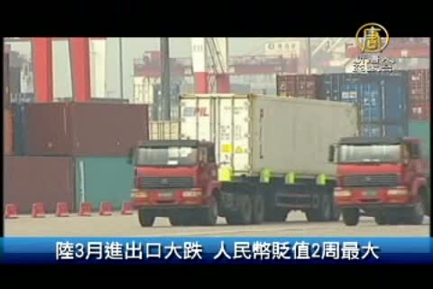 大陸海關總署4月10日公布數據顯示,大陸今年第1季和3月的進出口都雙雙下滑。其中,第1季出口和進口分別比去年同期下滑6.1%、1.2%,另外人民幣貶幅創2周來最大,中國經濟趨緩顯著。