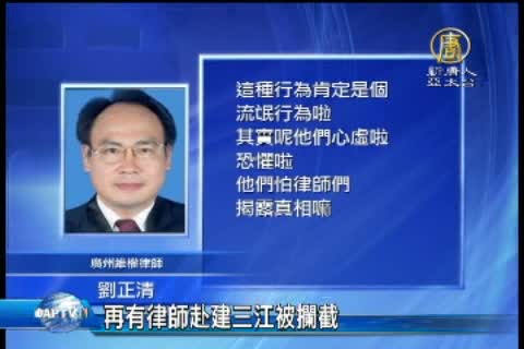 【新唐人亞太台2014年4月11日訊】持續關心黑龍江建三江案,日前,廣東一位律師準備赴當地參加營救行動,卻被國保直接從飛機場綁架走。律師表示,當地國保明確告訴他不準前往建三江。請看報導。
