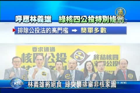 【新唐人亞太台2014年4月17日訊】前民進黨主席林義雄宣布,下週二要為反核無限期絕食。民進黨今天在立院委員會增加議程,排審非核家園案,不過,國民黨認為不合程序,應另行處理。目前沒有進度。