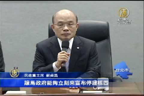 【新唐人亞太台2014年4月20日訊】為了解決核四爭議,民進黨主席蘇貞昌今天(20日)早上親自拜會台北市長郝龍斌,針對民進黨提出核四公投特別條例,郝龍斌表達開放的態度,也說會把蘇貞昌的意見傳達給馬總統,而郝龍斌也強調,核四安全令人無法信服,沒有看到安全曙光之前,郝龍斌也堅決反對核四營運。