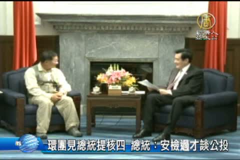 【新唐人亞太台2014年4月22日訊】今天是世界地球日,馬總統下午在總統府接見環保團體代表。馬總統表示,關於核四爭議,一切等核四通過安檢後,再去談公投問題。馬總統下午在總統府內接見包括荒野保護協會理事長賴榮孝、關懷生命協會創會理事長等環保團體代表,根據環團轉述,他們向總統提出對核四的疑慮。也向馬總統表示,林義雄對台灣未來非常擔心,才決定要禁食,馬總統則是回應,「如核四安檢未過,一切不動,如果通過安檢,再去談公投。」