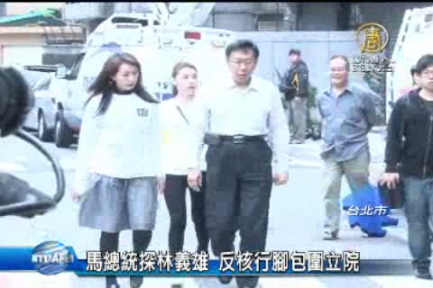 【新唐人亞太台2014年4月23日訊】新聞一開始帶您來看,前民進黨主席林義雄在義光教會禁食進入第二天。馬總統上午前往探視,他沒有和林義雄見面,只在留言本上簽名,然後請牧師轉交一張卡片,上面寫著,懇請林義雄保重身體,他願意代表政府承諾核四安檢完成後,交由全民公投來決定是否運轉,隨後總統便離開,停留時間不到3分鐘。