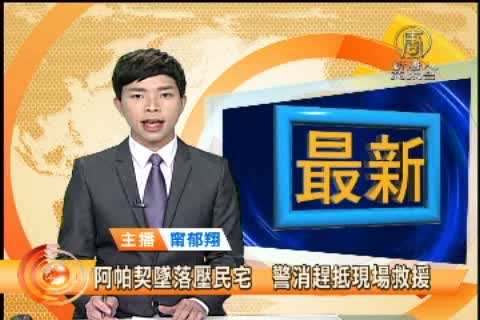 【新唐人亞太台2014年4月25日訊】新聞一開始來看一則最新消息。空軍1架阿帕契直升機今天上午10點多,疑似機械故障在桃園龍潭鄉撞到3樓民宅,警消獲報後已經趕到現場搶救,目擊民眾表示,2名飛官仍有生命跡象,已由軍方救護車後送國軍804醫院。有任何最新消息我們隨時為您做跟進報導。