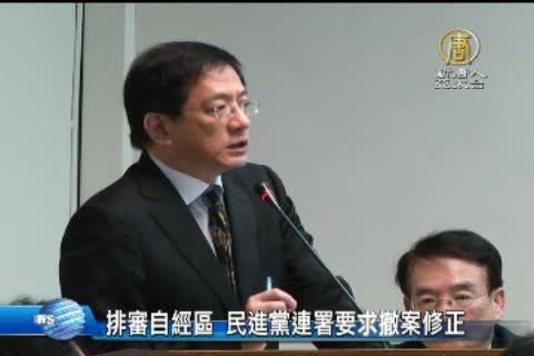 【新唐人亞太台2014年4月28日訊】立法院經濟、財政、內政委員會,今天排審自由經濟示範區特別條例草案,民進黨團聯署,要求行政院依公聽會討論,撤回原案重新修正,再送新草案,國民黨團則要求逐條審查。國發會主委管中閔,今天在委員會上表示,已經有依據公聽會,針對土地徵收、野生動物保育,及農業加值部分,修正十五條法案。但,因為只是部分條例修改,請教法規會意見後,認為可以在逐條審查時提出討論就好,不須撤案。而召委黃昭順,在管中閔報告完之後,即宣布休息協商離開委員會,不顧民進黨立委抗議雜音。