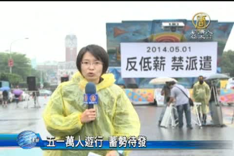 【新唐人亞太台2014年5月1日訊】新聞一開始先帶您來看,今天是五一勞動節,勞工團體預計將在今天下午上街遊行,雖然現在天氣不穩定,但總統府前凱道上已經有一些準備,我們連線到現場記者劉姿吟,來看稍早情況,姿吟。