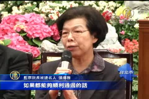 【新唐人亞太台2014年5月8日訊】今天總統府公布了,下屆監察委員被提名人名單,包含正副院長一共29人。監察院長被提名人張博雅首次公開露面,對於被傳捲入馬王政爭,她回答,行事一向公正,有信心通過立委認可。