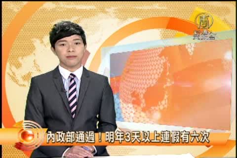 【新唐人亞太台2014年5月9日訊】明年開始,放假日遇週休,不會再被「吃假」。內政部宣布修法通過,明年開始,紀念日或節日在星期六的話,於前一個上班日也就是星期五補假;如果是遇上星期日的假日,就是禮拜一補假。內政部統計,明年3天以上的連假將有6次。有放假的紀念日及節日共計11日,加上週休二日,全年放假總日數為115日。