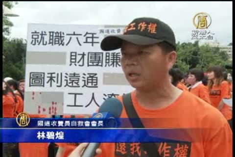 【新唐人亞太台2014年5月20日訊】馬總統執政六周年演說,來自全省各地的國道收費員自救會成員,穿著雨衣高呼口號,表示嚴正抗議要馬英九也到他們集結的場地座談,關心他們的就業權。