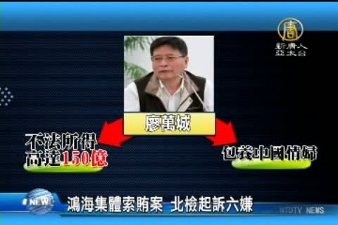 【新唐人亞太台2014年5月21日訊】鴻海集團前高層集體收回扣案,台北地檢署今天(21日)上午偵結,依違反證交法、刑法背信罪嫌起訴涉案的SMT副總廖萬城等6人。涉案層級最高的鴻海旗下SMT技術委員會前副主委廖萬城,因涉嫌長期指示技術委員會委員,向供應商索取回扣,並透過白手套郝緒光居中協助,以人頭藏匿贓款。不法所得高達150億,還傳出包養中國情婦,鴻海雖然在案發第一時間向中國報案,不過,中共方最後對相關被告做出不起訴處分,因此,鴻海轉而透過台灣司法尋求協助,檢調也在今年1月間發動搜索、約談,並將廖萬城、郝緒光收押禁見,今天鴻海發出聲明,籲