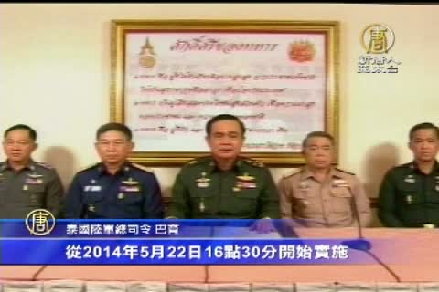 【新唐人亞太台2014年5月23日訊】泰國軍方昨天(22日)宣佈政變後,由軍方全面接管政府,並終止現行憲法,並根據戒嚴法實施宵禁。陸軍總司令巴拉育今天凌晨更透過電視台,宣佈在下任總理出現前,由他自任總理。軍方並傳喚前總理盈拉,必須在當地時間早上10點到軍方報到開會,不過目前還不確定盈拉是否出席,或是已經逃往海外。