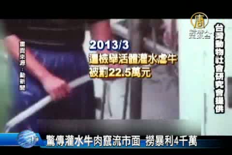 【新唐人亞太台2014年6月6日訊】鏡頭轉回台灣,沉寂好一陣子的食安問題今天又再引發討論。位在新北市的福伯屠宰場,是全台第二大牛隻屠宰場,卻被平面媒體踢爆,對牛體灌水增加重量,一年賺暴利4千萬元,而且這些問題牛肉流向雙北、基隆及桃園等地的攤商及餐廳。醫師指出,灌水肉容易遭大腸桿菌污染,如果吃下肚,恐怕會引發敗血症,嚴重還可能致死!