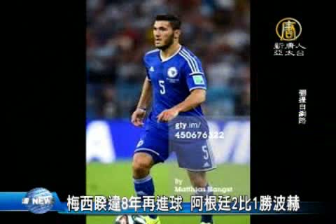 【新唐人亞太台2014年6月16日訊】新聞一開始來看到,世足賽F組首輪第1場,阿根廷2比1險勝波赫,阿根廷一哥梅西下半場,攻進世界盃的個人第2顆球,也是睽違8年再次破門。開場2分鐘,波士尼亞5號後衛柯拉西納奇不小心將球頂進自己球門,這顆烏龍球,讓阿根廷創本屆世足賽最快得分紀錄。開賽65分鐘,阿根廷靈魂人物梅西接獲隊友傳球,順利破門,雖然,波赫後來急追回一分,但反撲未果,阿根廷拿下勝利。