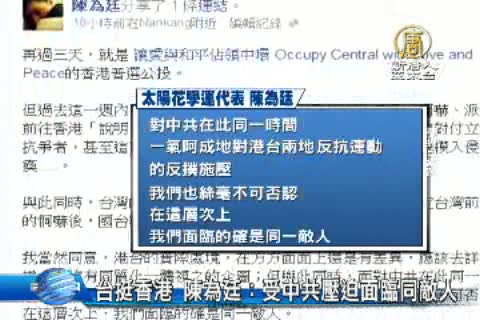 【新唐人亞太台2014年6月17日訊】禮拜天,香港就要舉行622公投爭普選,即使中共以白皮書威脅,關注聲浪還是越來越高,尤其是台灣的公民團體,台灣太陽花學運代表陳為廷在臉書上表示,中共企圖壓制台港公民力量的反撲,香港與台灣正面臨同一個敵人。