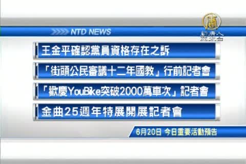 【新唐人亞太台2014年6月20日訊】接著來看到,今天,六月20日,星期五,有哪些重要的活動,上午九點,台灣高等法院民事庭,將處理「王金平確認黨員資格存在之訴」,「自己的孩子自己救、街頭公民審議十二年國教」,將在今天下午召開活動行前記者會,台北市長郝龍斌,將出席「歡慶YouBike突破2000萬車次」記者會。娛樂消息,金曲25週年特展,今天下午舉辦開展記者會。