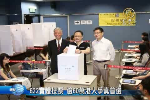 【新唐人亞太台2014年6月22日訊】香港公民發起由「和平佔中」「全民投票日」,實體投票站6月22日上午正式開啟,全港共有15個票站供市民以傳統方式投票,從20日網路投票開始累計至22日晚上6時已經有超過65萬港人投票。佔中發起人呼籲港府正視港人爭取真普選的訴求。