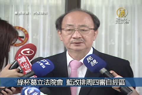 立法院今天原訂處理監院人事同意權審查時程的復議案,但因綠營佔據議場主席台,議事空轉一整天。國民黨團隨後開會討論,決定後天召開聯席委員會,審查「自由經濟示範區特別條例草案」。民進黨團回應,自經區是重大爭議法案,國民黨如果硬要排,民進黨將嚴格把關。