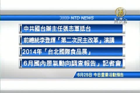 【新唐人亞太台2014年6月25日訊】接著來看到,今天,六月25日,星期三,有哪些重要的活動,今天中午,中共國台辦主任張志軍將抵台。許多民間團體,也已經準備好,進行抗議。下午,前總統李登輝舉行「第二次民主改革」演講。財經活動來看到,2014年「台北國際食品展」,今天上午開幕,台經願將公布6月國內景氣動向調查報告。