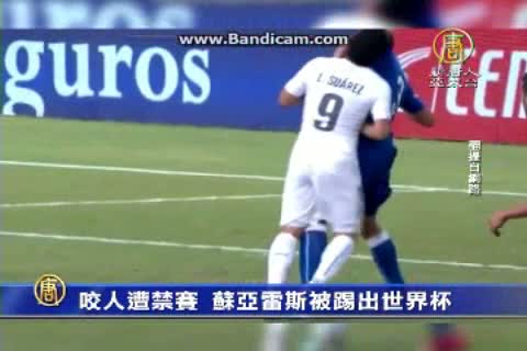 【新唐人亞太台2014年6月27日訊】另外一個世足話題,烏拉圭球員蘇亞雷斯,在比賽中咬傷義大利球員,週四,國際足聯FIFA宣布,蘇亞雷斯被禁賽9場,並在4個月內,不得從事任何足球活動。