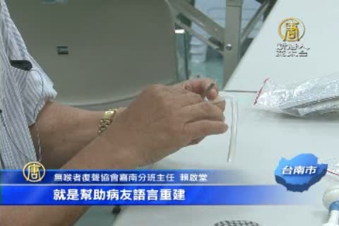 【新唐人亞太台2014年6月30日訊】能夠開口講話,表達心聲,對一般人來說是件簡單的事情,可是對喉頭氣切的病友來說,可是一件困難的事;台灣的無喉者復聲協會,他們致力於幫助喉頭氣切的朋友們,學習怎麼講話,找回失去的「聲音」。