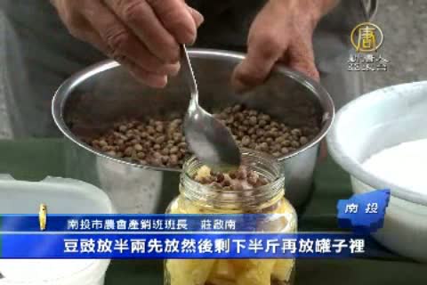 南投市農會產銷班班長 莊啟南:「將半斤鳳梨先裝入玻璃罐中,放半兩豆豉,然後再放入半斤鳳梨,接著放入半兩鹽、半兩豆豉、三兩糖,都放進去玻璃罐中,最後蓋上蓋子。」