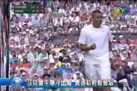 【新唐人亞太台2014年7月2日訊】再來看溫網的比賽情況,週二的賽況,可謂冷門迭爆。本屆奪冠熱門、剛剛拿下法網女單冠軍的莎拉波娃意外出局,而男單二號種子納達爾也爆冷止步8強。還好,網球天王費德勒一如預期,輕鬆晉級。