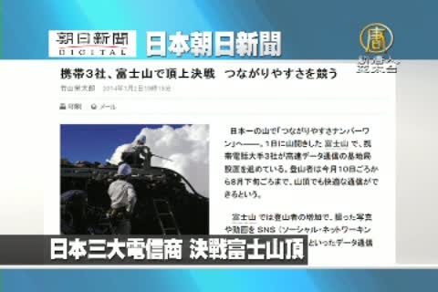 【新唐人亞太台2014年7月3日訊】來看到日本朝日新聞報導:富士山7月1日開山,開始迎接登山客。日本三大電信商,也加快在山頂建置4G基地台。登山者最慢八月下旬前,就可以在山頂享受高速網路。