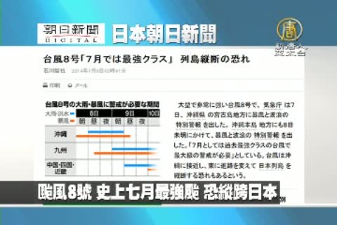【新唐人亞太台2014年7月8日訊】來看到日本朝日新聞報導: 強烈颱風浣熊朝日本前進。日本氣象廳昨天對沖繩的宮古島地區,發布暴風及大浪警報。氣象廳表示,這是過去七月份以來最強的颱風,繼續往東前進將可能縱跨日本列島。