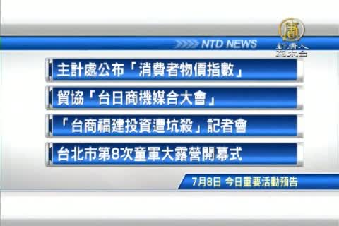 【新唐人亞太台2014年7月8日訊】接著看到今天,七月8日,星期二,有哪些重要的活動,主計處公布「消費者物價指數」,貿協舉辦「台日商機媒合大會」, 台灣團結聯盟立委在立院有一場「台商福建投資遭坑殺」記者會,晚間七點30分,中正紀念堂民主大道將舉辦台北市第8次童軍大露營開幕式。
