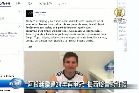 【新唐人亞太台2014年7月10日訊】阿根廷睽違24年再度擠入冠軍賽,也將是第三度和德國隊競爭世界盃冠軍,就在稍早, 阿根廷王牌前鋒梅西在臉書貼上照片。梅西說,我很自豪能成為這個球隊的一部分!我們已經走到最後了!!讓我們享受吧!再走小小的一步。2小時內,就破百萬人按讚,究竟,梅西可不可能成為本屆世足金靴獎得主,今天晚間,我們還會有更精彩的分析報導。