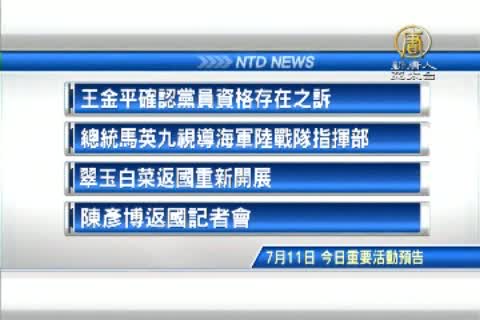 【新唐人亞太台2014年7月11日訊】接著來看到今天,七月11日,有哪些重要的活動,上午台灣高等法院民事庭,王金平確認黨員資格存在之訴。總統馬英九視導海軍陸戰隊指揮部。國立故宮博物院藏品「清 翠玉白菜」返國重新開展。陳彥博玻利維亞賽事返國記者會。