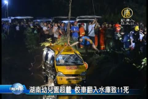 【新唐人亞太台2014年7月11日訊】中國又發生校車安全事故,這次地點是在湖南省湘潭市。一間村幼兒園校車在送孩子回家途中翻入水庫,導致11人遇難。