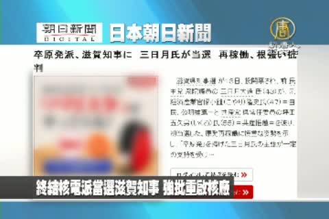 【新唐人亞太台2014年7月15日訊】來看到日本朝日新聞報導:終結核電派當選滋賀知事,強力批判重新啟動核電廠。