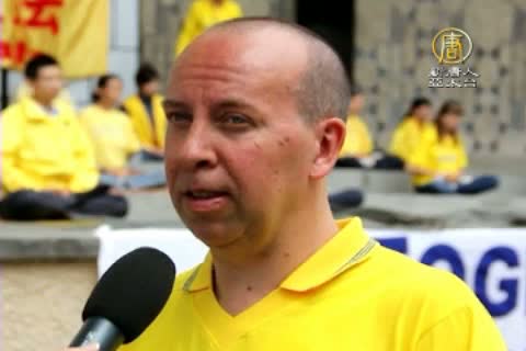 伴隨著祥和的功法演示,法輪功學員輪流用德語和中文向人們介紹法輪大法讓上億修煉者身體健康,精神昇華,Aleardo Manieri就是其中的一位。
