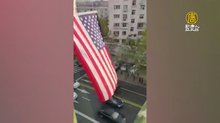 2020-10-21 14:35:22山東青島維權人士隋雙勝,星期一(19號)在自家公寓的窗外懸掛美國、英國、澳洲的國旗,大聲譴責中共的暴政。他在影片中高喊:「民主萬歲,獨裁必亡!」樓下聚集許多警察、城管和警車。