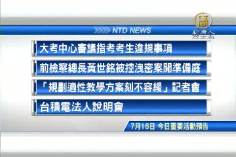 【新唐人亞太台2014年7月16日訊】接著,來看到今天,七月16日,星期三,有哪些重要的活動。大考中心審議指考考生違規事項。前任檢察總長黃世銘被控洩密案,開準備庭。國教行動聯盟「規劃適性教學方案刻不容緩」記者會 。台積電法人說明會。