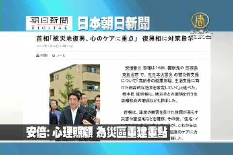 【新唐人亞太台2014年7月17日訊】來看到日本朝日新聞報導: 16日,日本首相安倍晉三到宮城縣視察。安倍走訪了災民居住的公共住宅。安倍表示,接下來,如何照顧災民的身體與心理健康,是必須的努力。