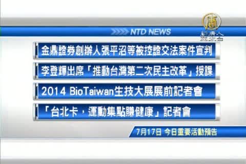 【新唐人亞太台2014年7月17日訊】接著來看到,今天,七月17日,星期四,有哪些重要的活動,上午十點,金鼎證券創辦人張平沼等被控證交法案件宣判。前總統李登輝出席「推動台灣第二次民主改革」研習營授課。財經活動,2014BioTaiwan生技大展展前記者會。「台北卡,運動集點賺健康」記者會。