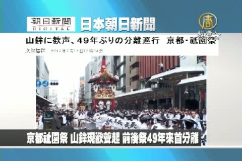 【新唐人亞太台2014年7月18日訊】來看到日本朝日新聞報導: 17日,京都迎來最盛大的祭典祉園祭。祉園祭前祭的高潮,山鉾巡行在京都市中心展開。