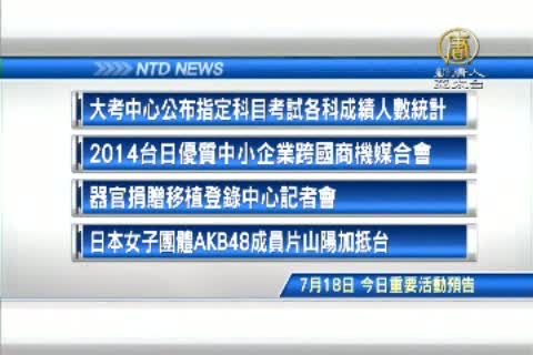 【新唐人亞太台2014年7月18日訊】接著來看到,今天,七月18日,有哪些重要的活動,上午十點,大考中心公布 103 學年度指定科目考試各科成績人數統計資料,財經訊息,2014台日優質中小企業跨國商機媒合會。器官捐贈移植登錄中心「器捐加註、愛接力」記者會。娛樂消息,日本女子團體AKB48成員片山陽加,將在今天上午抵達臺北松山機場。