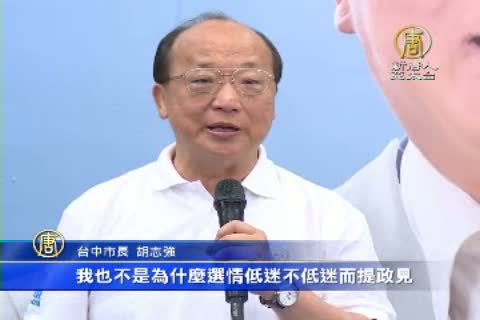 台中市長 胡志強:「我們都知道現在選情跟兩三個月以前,已經完全不一樣,我們都知道最近有新的民調出來,所以我覺得選情現在並不低迷,我也不是為什麼選情低迷不低迷而提政見。」