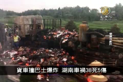 大陸湖南今天凌晨發生嚴重交通事故,一輛貨車追撞大巴士後爆炸,周圍五輛車被波及燒毀,目前已經確認38人死亡,5人受傷。
