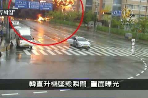 南韓一架參與「歲月號」渡輪船難失蹤者搜救的消防直升機,前天上午結束搜救工作歸隊時,疑因天候不佳墜毀光州市區,機上5人全數罹難,有行車紀錄器拍到直升機墜毀瞬間,只見直升機快速往地面墜下,隨後發生爆炸,附近的民眾及用路人都被嚇傻,紛紛離開直升機失事現場。